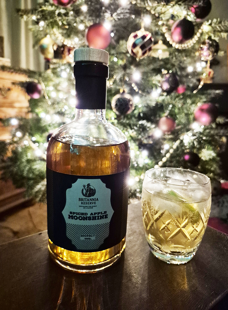 Pour the Britannia Reserve Spiced Apple Moonshine into a tumbler or highball glass, add ice cubes, slice of lime and top up with ginger ale. Stir.