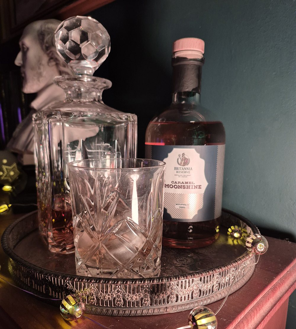 Pour the Britannia Reserve Charamel Moonshine and Whisky into a tumbler or lowball glass, add ice cubes and stir. For a longer drink, top up with ginger ale